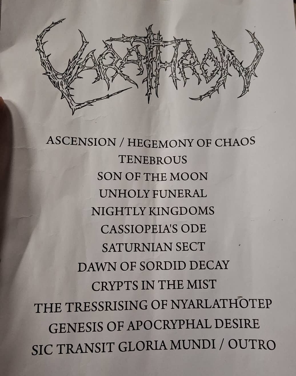 Παίρνοντας μια μεγάλη ανάσα από το χάος που μας χάρισαν οι Death Strike, το μαγαζί αρχίζει να γεμίζει όλο και περισσότερο, με τον κόσμο να περιμένει το τελευταίο headline act που θα ακολουθούσε και θα έκλεινε τη δεύτερη μέρα, και μάλιστα δικό μας όνομα, το οποίο πρόκειται για τους Ιστορικούς Hellenic Black Metallers από τα Ιωάννινα, Varathron! Έχουμε μιλήσει ξανά για τη μπάντα το καλοκαίρι, όταν είχαν παίξει σε ανοιχτό χώρο, στο θέατρο του Λυκαβηττού με τους Rotting Christ, αυτή τη φορά τους βλέπουμε σε κλειστό χώρο, μπορούμε να πούμε πως ήταν ένα εξίσου θριαμβευτικό performance με μπόλικη ενέργεια και σαρωτικό rhythm section, κι ένα setlist που τίμησε κατά πολύ και τις πρώιμες (“His Majesty At The Swamp”, “Walpurgisnacht”, και το demo του “Genesis of Apocryphal Desire”) και τις τωρινές (“Patriarchs of Evil”, όπως και το περσινό τους “The Crimson Temple” που έκανε φοβερή εντύπωση) τους κυκλοφορίες, τραγούδια σαν τα “Hegemony of Chaos”, “Tenebrous”, “Saturnian Sect”, όπως φυσικά και τα “Son of the Moon”, “Unholy Funeral”, “Cassiopeia’s Ode” και “Tressrising of Nyarlathotep” που σε βάζουν για τα καλά στο Black κλίμα με τις μελωδίες, τις ταχύτητες, και το παραδοσιακό παίξιμο που βγαίνει από τα riffs των Αχιλλέα Καλαντζή και Σωτήρη Κόκκινου. Τα φωνητικά του Στεφάνου Necroabyssious βρίσκονται στην αμκή τους, η ανταπόκριση από το κοινό εξίσου θερμή και δυνατή με αυτή των Death Strike, το pit ακούραστο και να δίνει μονίμως πόνο με όλο του το είναι, και το κλείσιμο στο “Genesis of Apocryphal Desire” ήταν η χαριστική βολή για τελειώσει με τον καλύτερο τρόπο το σαββατόβραδο, σιν τις φωτογραφίες, τις υπογραφές κι άλλα πολλά που ακολούθησαν στο τέλος του show.