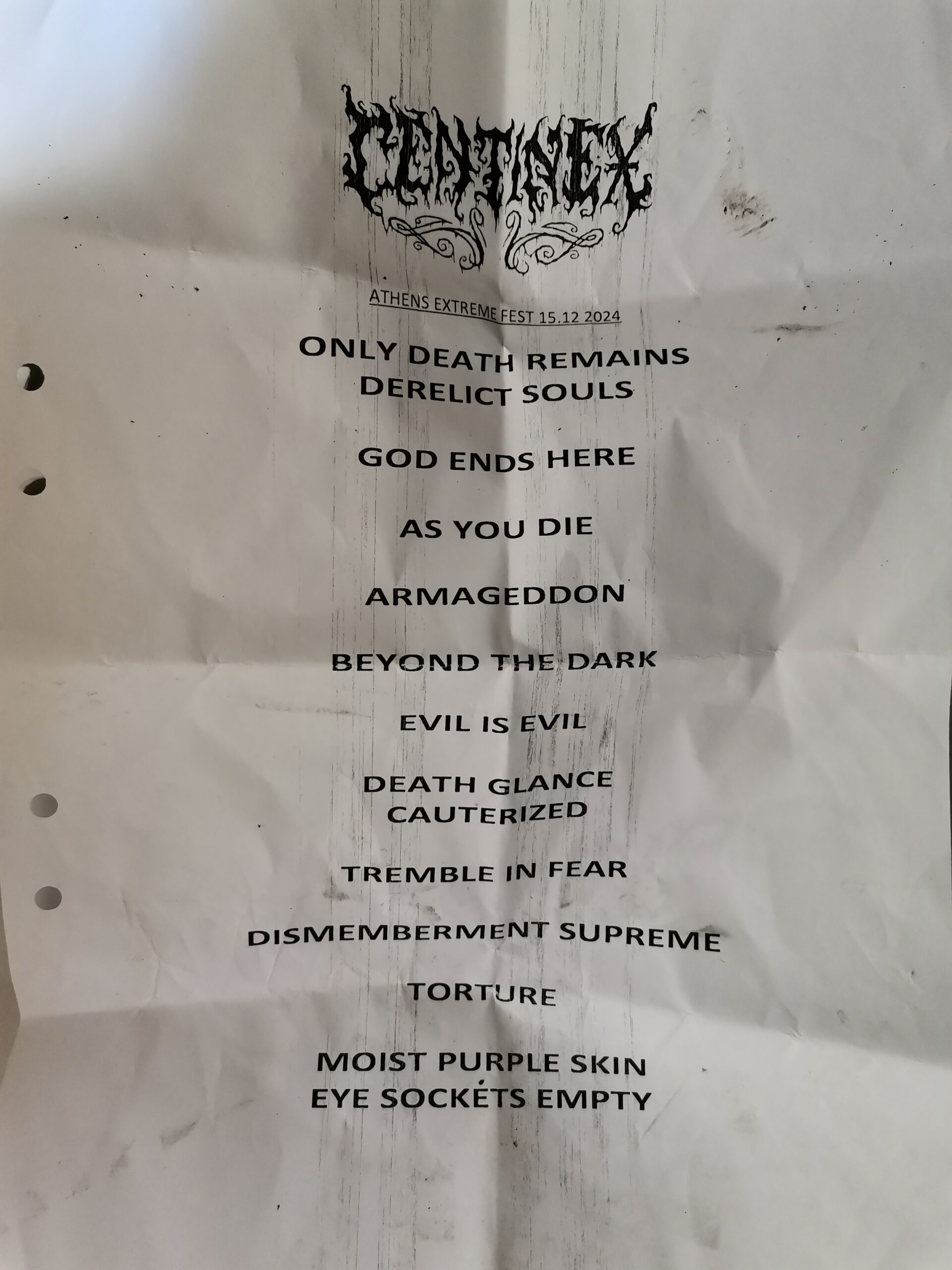 Έρχεται η ώρα για το προ-τελευταίο όνομα να πατήσει το πόδι του στη Γη και να τα σαρώσει όλα στο Ναό, κάνοντας τη πρώτη του εμφάνιση επί Ελληνικού εδάφους, φέρνοντας μπόλικο άρωμα Σουηδίας, φυσικά αναφερόμαστε στους Σουηδούς Death Metallers, Centinex! Ήταν τόσο ενθουσιασμένοι όσο κι ο κόσμος που τους έβλεπε από κάτω, το τι πανικός επικράτησε στο pit μόνο ένας θεός (“…Ends Here”) το ξέρει (καταλήγοντας στο σημείο να κατεβαίνει ο Henrik Anderson (θεούλης) με το μικρόφωνο και να είναι στη μέση ενώ οι υπόλοιποι κάνουν κύκλους γύρω του στο “Torture”, σίγουρα μια από τις κορυφαίες στιγμές του Athens Extreme), Death Metal Αμερικανο-Σουηδικού τύπου, κάτι παρόμοιο που μπορεί να ακούσει κανείς και σε συγκροτήματα όπως οι συμπατριώτες τους Vomitory (ο κιθαρίστας τους Jörgen Kristensen φόραγε μπλουζάκι τους) και Bloodbath, με μερικές Obituary και Hail of Bullets πινελιές που έδεναν με ωραίο τρόπο στο ύφος των Centinex, το παρουσιαστικό και το παίξιμο τους καθ’όλη τη διάρκεια του set (που ήταν κυρίως από νέες κυκλοφορίες, συγκεκριμένα από το “Redeeming Filth” του 2014 μέχρι το πρόσφατο single του “As You Die”) λειτουργούσε σαν ρόπαλο με καρφιά που χτυπούσε ό,τι έβρισκε γύρω του, χωρίς έλεος. Αυτή ήταν σίγουρα μία από τις πιο δυνατές επιλογές, και δε θα μπορούσε να υπάρξει καλύτερη απ’αυτήν για τη τελευταία μέρα του Festival, ας ελπίσουμε να τους απολαύσουμε και πάλι πολύ σύντομα!